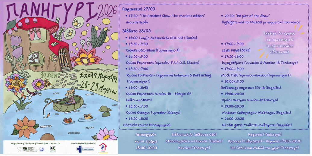 Moraitis Escape (313) 25 λεπτά, 4 άτομα, 1 σκοπός: Να φέρετε σε πέρας την αποστολή σας και να αποδράσετε! Δηλώσετε συμμετοχή στο Γραφείο του Λυκείου, δεσμεύοντας συγκεκριμένη μέρα και ώρα. Προπληρωμή: 16 ευρώ ανά ομάδα. Σχεδιασμός: Όμιλος Παιχνιδιών Στρατηγικής Γυμνασίου και Λυκείου. Face Painting – Κοτσιδάκια (ισόγειο, εξωτερικοί χώροι) Θέλετε να κάνετε μία αλλαγή, αλλά […]